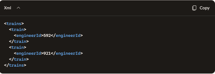 D. Starts with {( trains: ... )}: β invalid syntax; the placement of {( is incorrect.