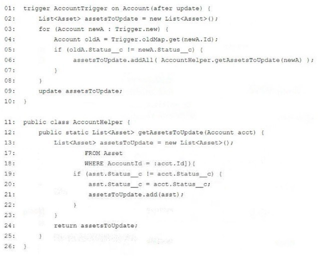 A. Change the gerAssetsToUpdac= method to process all Accounts in one call and call it outside of the for loop that starts on line 03.